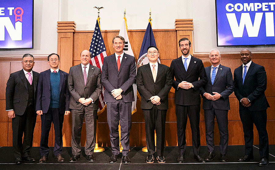 12일(현지시각) 버지니아주 체사피크(Chesapeake)시 희토류 자석 공장 투자 발표에서 폴 대버(Paul Dabbar) 미국 상무부 차관, 글렌 영킨(Glenn Youngkin) 버지니아 주지사, 구본규 LS전선 대표(왼쪽 3번째부터) 등 참석자들이 기념촬영을 하고 있다.