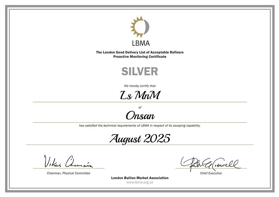LS MnM은 9월 18일 런던금시장연합회(LBMA: London Bullion Market Association)가 실시한 금은 부문 주조·분석 기술평가(PAM: Proactive Monitoring) 인증을 3회 연속 갱신했다. 특히 금 부문 PAM 인증은 국내 기업 중 유일하다.