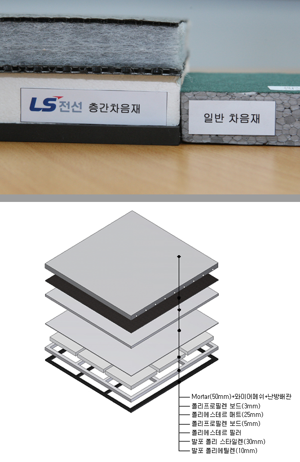 LS전선의 층간 차음재 ‘LS 제로노이즈시스템’이 업계의 주목을 받고 있다. LS전선의 층간 차음재와 일반 차음재의 비교 사진.