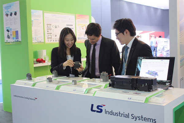 LS산전은 전동기 토크(Torque)와 관련 컨트롤 기능을 제어하는 ‘Power Control Unit’, 차량 내 장착되어 배터리 충전을 담당하는 ‘On-Board Charger’, 배터리 전력의 안정적인 공급 및 차단을 맡는 ‘EV 릴레이’와 ‘BDU(Battery Disconnect Unit)’, 충전 스탠드 등을 전시해 관람객들의 이목을 끌었다.
