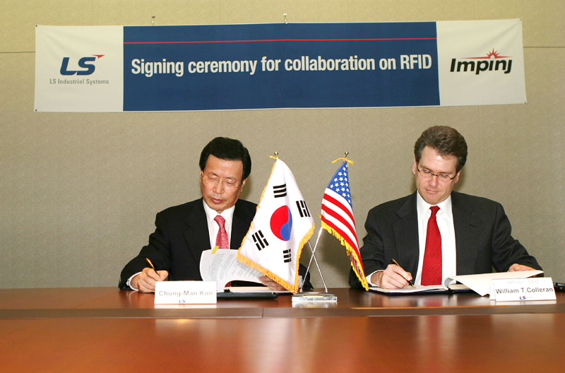 LS산전(대표: 金正萬 www.lsis.biz)은 1일 서울 연세빌딩 본사에서 LS산전 김정만 사장과 美 임핀지(Impinj)社 콜러랜(William Colleran) 사장이 참석한 가운데 양사가 RFID(전자태그)에 대한 기술제휴를 맺었다고 밝혔다.