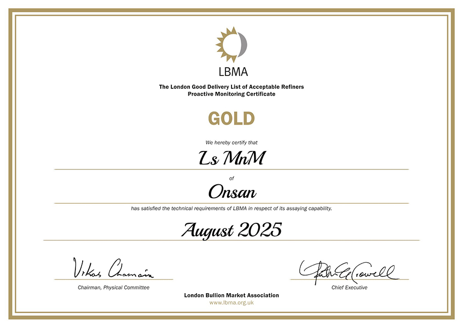 LS MnM은 9월 18일 런던금시장연합회(LBMA: London Bullion Market Association)가 실시한 금은 부문 주조·분석 기술평가(PAM: Proactive Monitoring) 인증을 3회 연속 갱신했다. 특히 금 부문 PAM 인증은 국내 기업 중 유일하다.